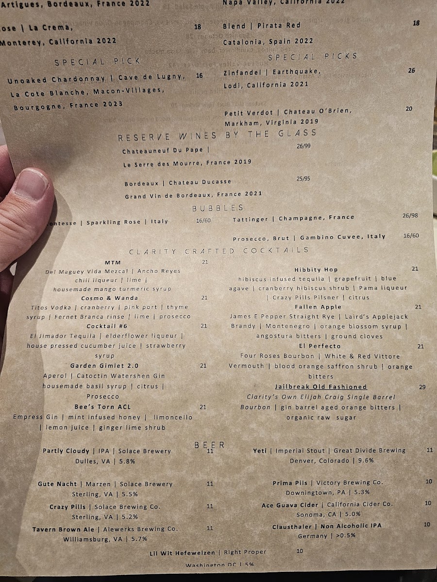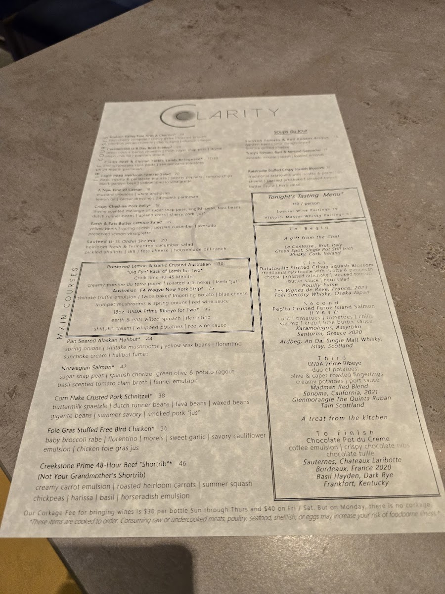 The menu at Clarity offers a refined yet approachable selection that blends New American, French steakhouse, and seafood influences, all complemented by a thoughtfully curated wine bar. It’s a place where you can find carefully prepared dishes perfect for both a relaxed dinner and a more special occasion.